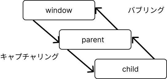 キャプチャリングフェーズでは、イベントの伝播が最上位のwindowオブジェクトから順に子要素を伝搬していき、イベントが発生した要素まで同じイベントが順番に伝わっていきます。