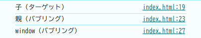 キャプチャリングフェーズとは違って、ターゲットから最上位のwindowに向かって伝播していくのが分かると思います。